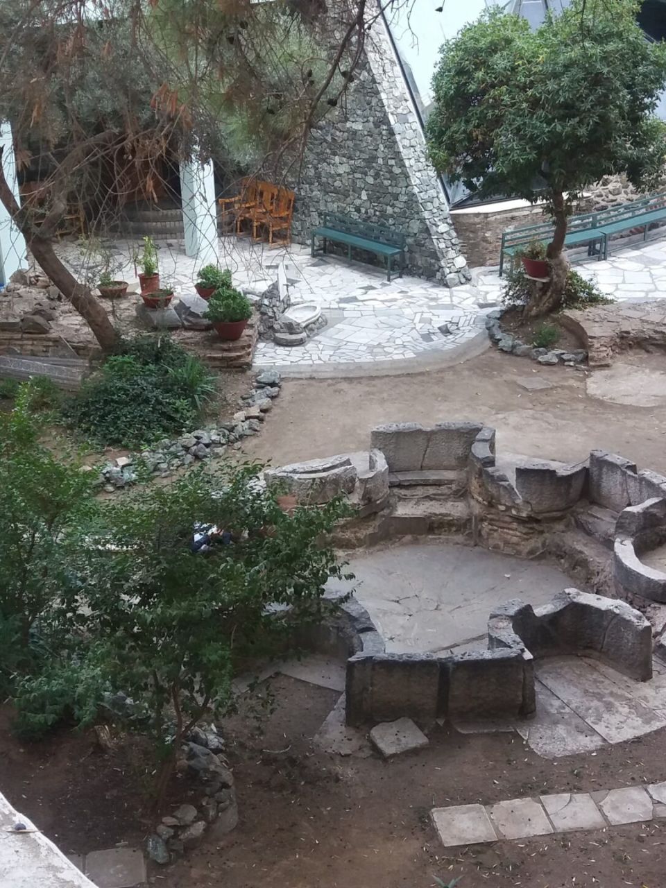 Από τον αρχικό ψηφιδωτό διάκοσμο του ναού διασώθηκαν παραστάσεις στο ιερό και στον τρούλο, όλες μεταγενέστερες της ίδρυσής του. Στην αψίδα του ιερού κυριαρχεί η μορφή της Παναγίας, καθισμένης σε θρόνο, με τον Χριστό στην αγκαλιά. Το ψηφιδωτό αυτό αντικατέστησε μεγάλο εικονομαχικό σταυρό, που διακρίνεται ακόμη αχνά στο χρυσό βάθος. Το κέντρο της καμάρας του ιερού καταλαμβάνει κυκλικό μετάλλιο με σταυρό, ενώ στις απολήξεις της καμάρας αναπτύσσεται τάπητας από επάλληλα τετράγωνα, που εγγράφουν σταυρούς και φύλλα φοίνικα. Στη βάση αυτών των συνθέσεων αναπτύσσεται επιγραφή με τα μονογράμματα των συναυτοκρατόρων Κωνσταντίνου Στ΄ και Ειρήνης και του επισκόπου Θεόφιλου, που είχε λάβει μέρος στην Ζ’ Οικουμενική Σύνοδο, της Νίκαιας, το 787.