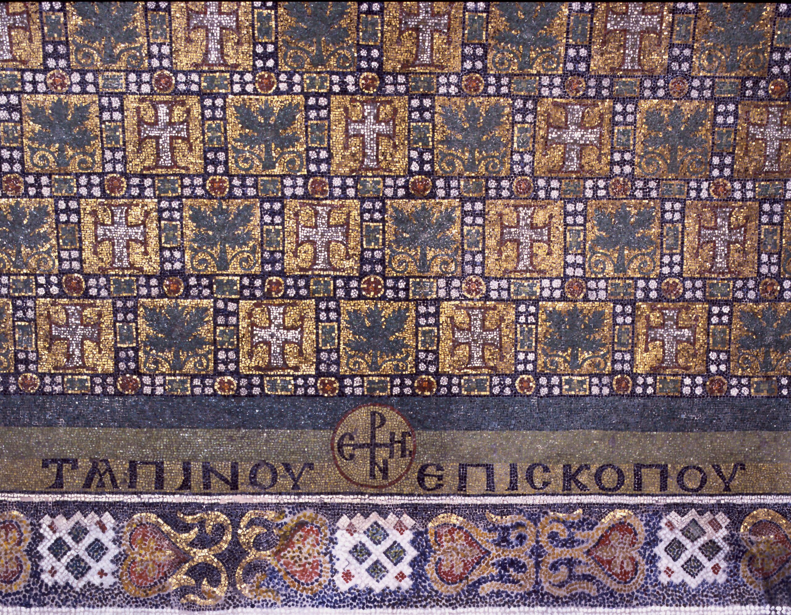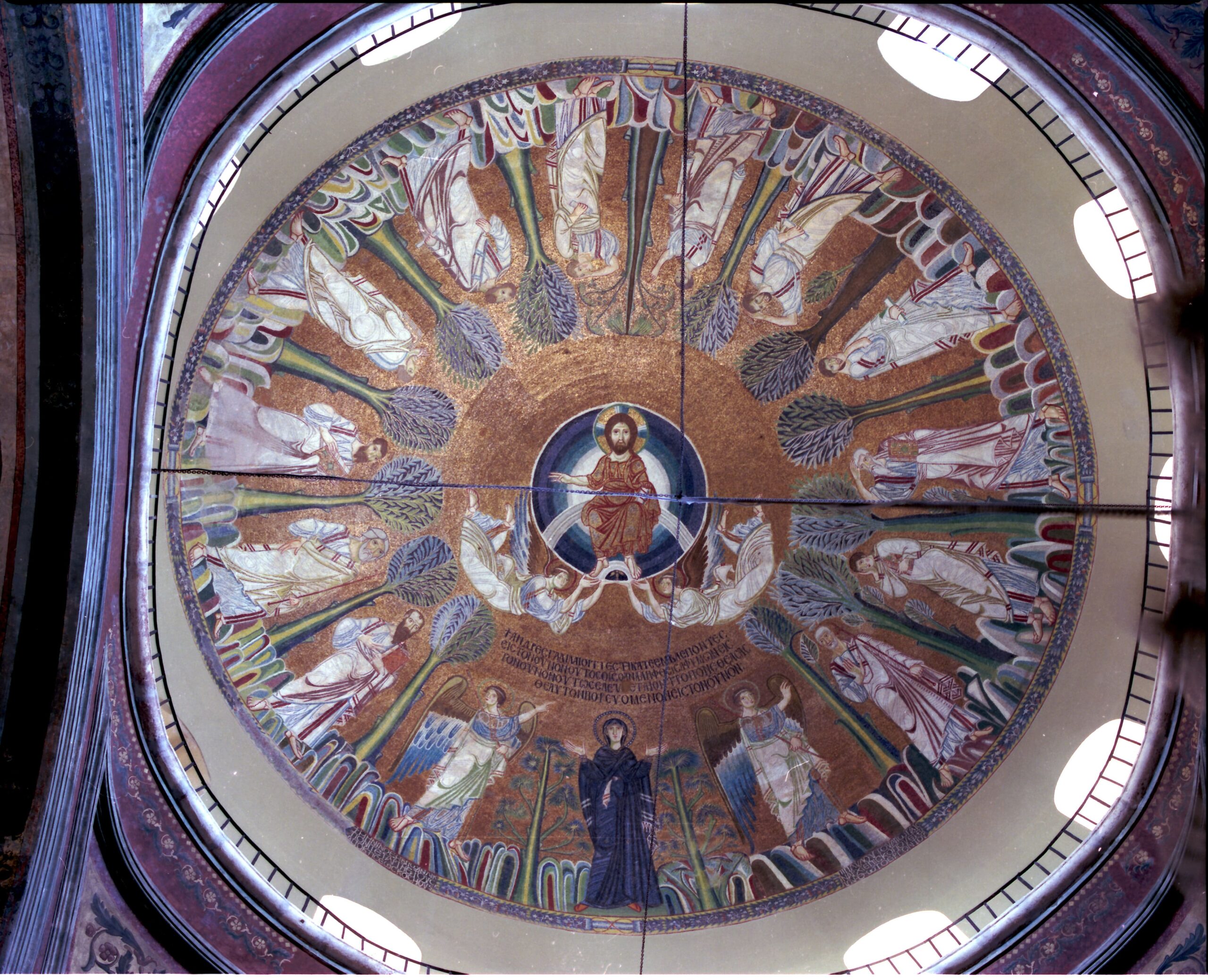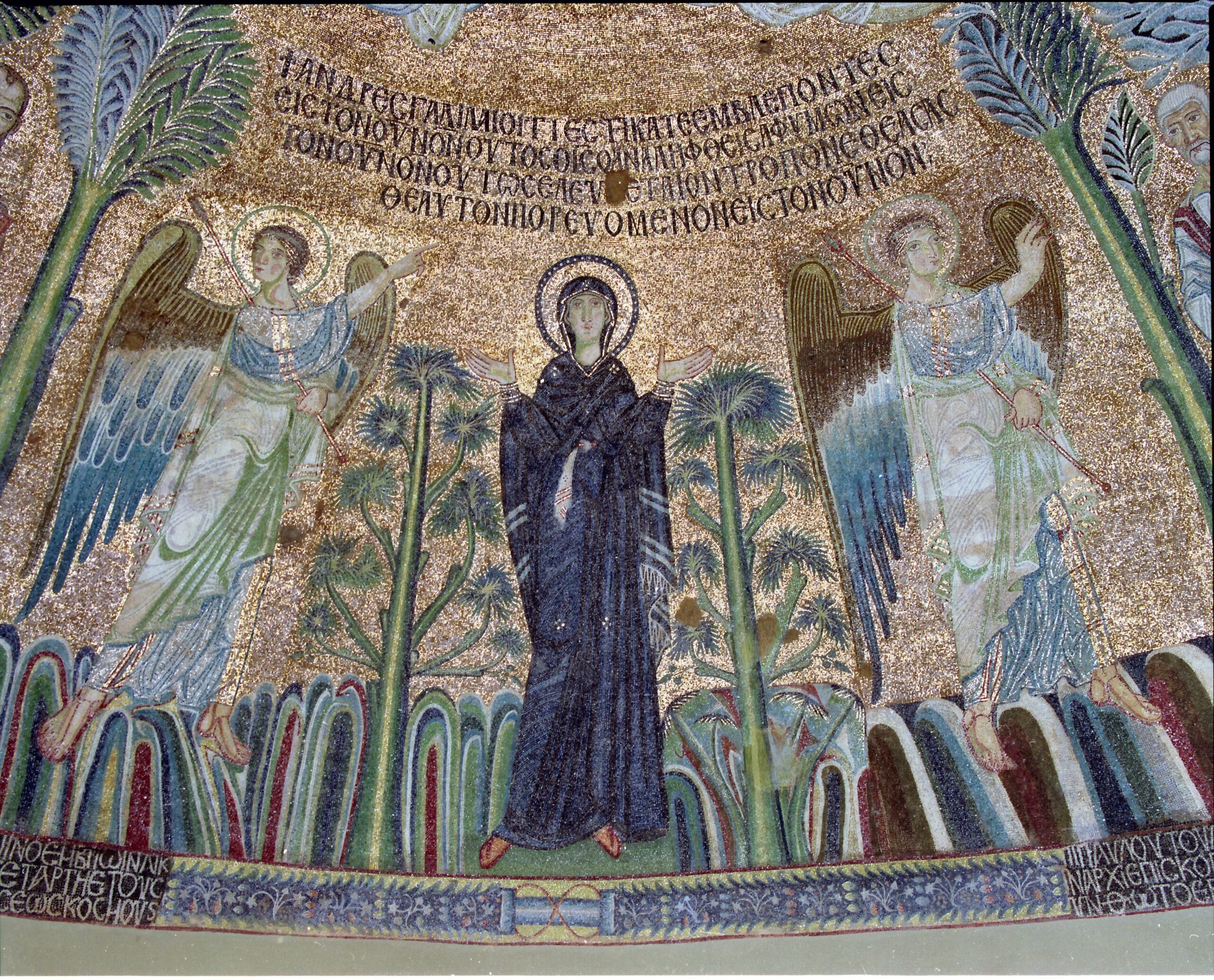 Από τον αρχικό ψηφιδωτό διάκοσμο του ναού διασώθηκαν παραστάσεις στο ιερό και στον τρούλο, όλες μεταγενέστερες της ίδρυσής του. Στην αψίδα του ιερού κυριαρχεί η μορφή της Παναγίας, καθισμένης σε θρόνο, με τον Χριστό στην αγκαλιά. Το ψηφιδωτό αυτό αντικατέστησε μεγάλο εικονομαχικό σταυρό, που διακρίνεται ακόμη αχνά στο χρυσό βάθος. Το κέντρο της καμάρας του ιερού καταλαμβάνει κυκλικό μετάλλιο με σταυρό, ενώ στις απολήξεις της καμάρας αναπτύσσεται τάπητας από επάλληλα τετράγωνα, που εγγράφουν σταυρούς και φύλλα φοίνικα. Στη βάση αυτών των συνθέσεων αναπτύσσεται επιγραφή με τα μονογράμματα των συναυτοκρατόρων Κωνσταντίνου Στ΄ και Ειρήνης και του επισκόπου Θεόφιλου, που είχε λάβει μέρος στην Ζ’ Οικουμενική Σύνοδο, της Νίκαιας, το 787.