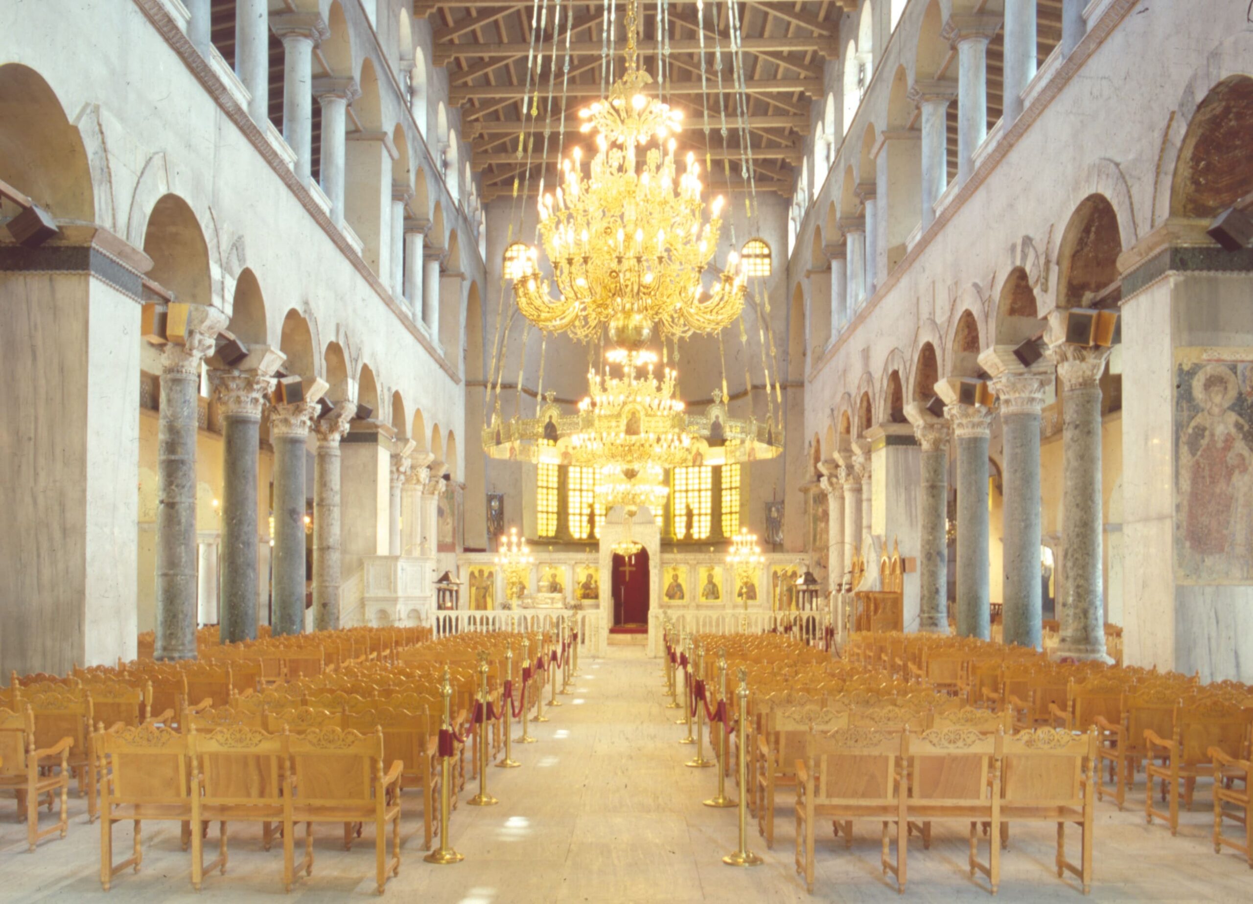 Κρύπτη: Βρίσκεται κάτω από το εγκάρσιο κλίτος της βασιλικής. Όταν τον 5ο αιώνα ιδρύεται ο πρώτος μεγάλος ναός προς τιμήν του Αγίου, το άλλοτε ισόγειο διαμέρισμα των ρωμαϊκών δημόσιων θερμών ενσωματώνεται ως ανοιχτό αίθριο και η κεντρική του κρήνη μετασκευάζεται σε εξέδρα αγιάσματος. Παραμένει, μαζί με το Κιβώριο, κύριος τόπος προσκύνησης του Αγίου, ενώ από τον 10ο έως και τον 14ο αι αποτελεί κέντρο της Μυροβλησίας του. Στο τέλος της περιόδου εγκαταλείπεται, σταδιακά επιχωματώνεται και καταχώνεται πλήρως, κατά την μετατροπή του ναού σε τζαμί, το 1493. Για τους επόμενους αιώνες η Κρύπτη θα παραμείνει θαμμένη κάτω από φερτές επιχώσεις και η ύπαρξή της θα ξεχαστεί. Αποκαλύπτεται ξανά, μόλις το 1917, όταν στη μεγάλη πυρκαγιά υποχωρεί μέρους του δαπέδου του ναού. Στη συνέχεια αποχωματώνεται, αναστηλώνεται κατά περιόδους μέχρι το 1948, οπότε και διαμορφώνεται σε εκθεσιακό χώρο με αρχαιολογικά ευρήματα προερχόμενα από το ναό.