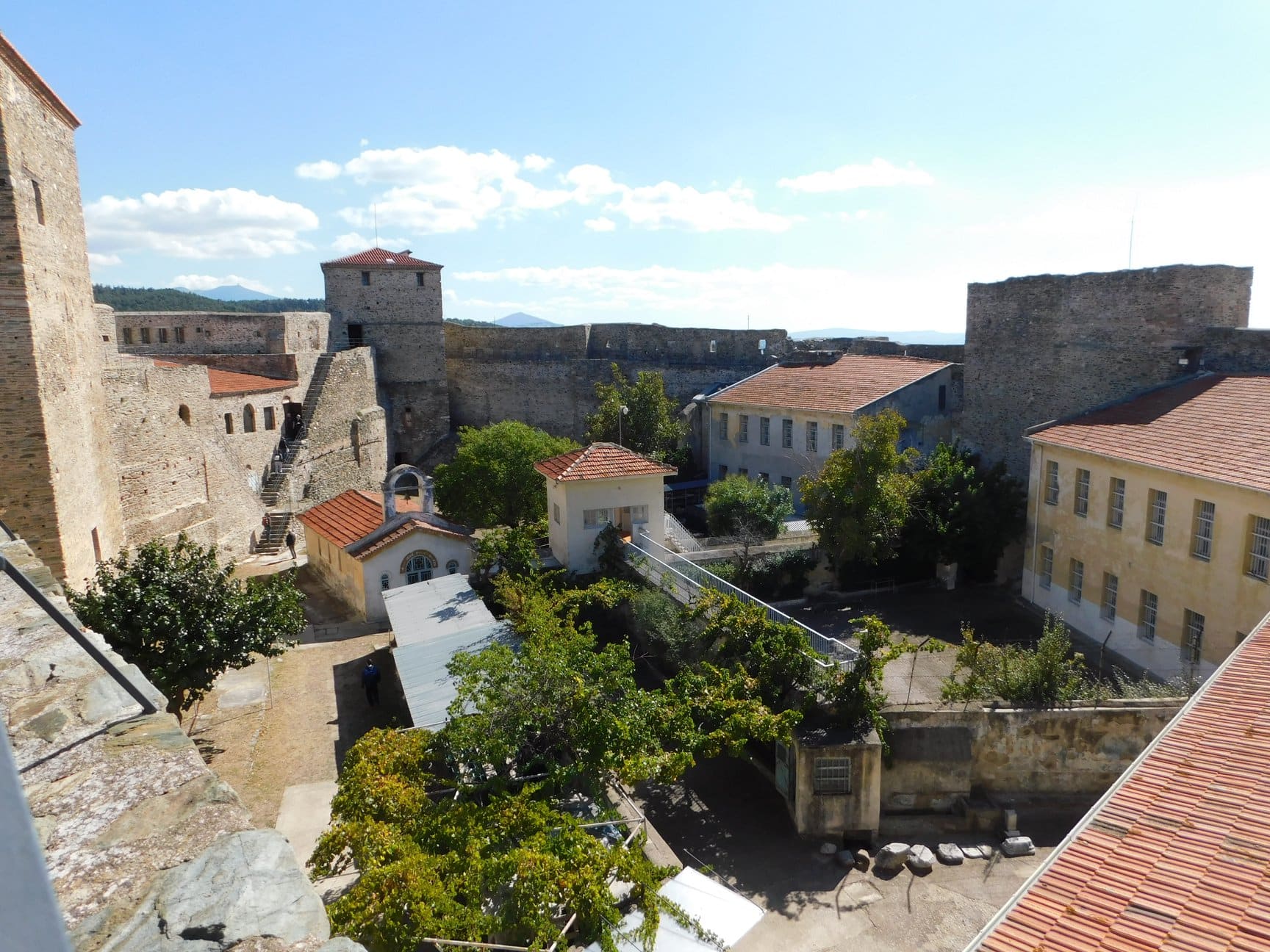 Το φρούριο του Επταπυργίου, γνωστό και με την οθωμανική ονομασία Γεντί Κουλέ (Yedi Kule), βρίσκεται στο βορειοανατολικό άκρο της οχύρωσης της πόλης, στο ψηλότερο σημείο της βυζαντινής ακρόπολης. Δύο ενότητες συνθέτουν τη σημερινή του μορφή: το βυζαντινό φρούριο με δέκα (10) πύργους, τα μεταξύ τους μεσοπύργια διαστήματα και τον περίδρομο, και τα νεότερα κτήρια που έχουν οικοδομηθεί εντός και εκτός του φρουρίου και συνδέονται με τη χρήση του χώρου ως φυλακή. Η βόρεια πλευρά του Επταπυργίου αποτελεί τμήμα του βυζαντινού τείχους της ακρόπολης, με πέντε εναλασσόμενους ορθογώνιους και τριγωνικούς πύργους, στο οποίο προστέθηκε το νότιο τμήμα με τους μικρότερους ορθογώνιους πύργους, για το σχηματισμό του κλειστού πυρήνα του φρουρίου. Κατά τους υστεροβυζαντινούς και πρώιμους οθωμανικούς χρόνους, έγιναν ανακτίσεις πύργων και επεμβάσεις σε διάφορα σημεία του φρουρίου, όπως μαρτυρεί και η εντοιχισμένη, πάνω από την κεντρική είσοδο επιγραφή του 1431, αμέσως μετά την κατάληψη της πόλης από τους Οθωμανούς.