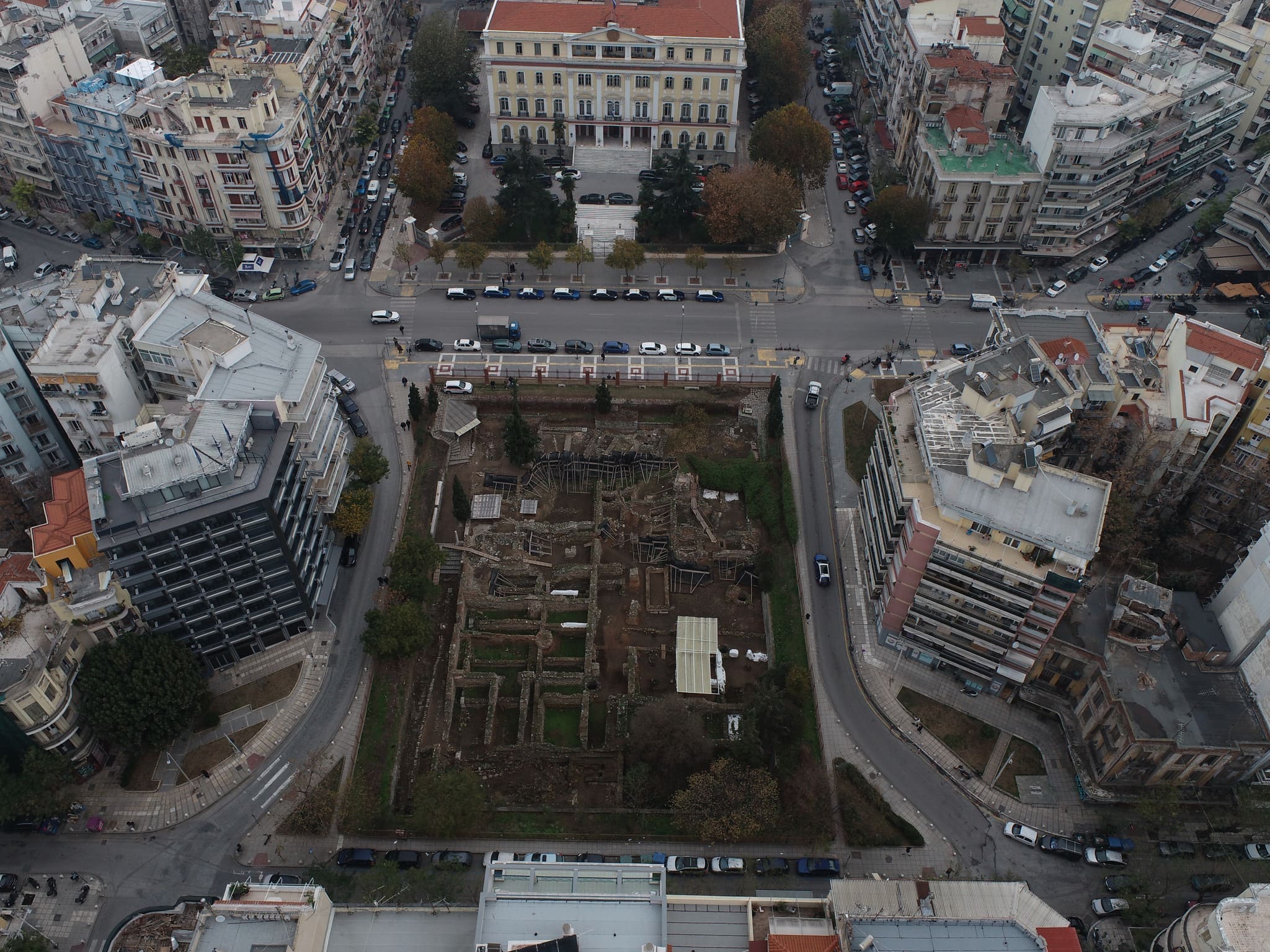 Οι αρχαιολογικές εργασίες στην πρώην Πλατεία Διοικητηρίου πραγματοποιήθηκαν στο πλαίσιο της απόφασης του Δήμου Θεσσαλονίκης το 1987 για την κατασκευή υπόγειου σταθμού αυτοκινήτων, η οποία τελικά ματαιώθηκε με την κήρυξη της θέσης ως αρχαιολογικού χώρου. Αποκαλύφθηκε το μεγαλύτερο τμήμα μίας οικοδομικής νησίδας της αρχαίας πόλης με διαδοχικές οικοδομικές φάσεις από τα ελληνιστικά έως και τα οθωμανικά χρόνια, καθώς και ο δρόμος που όριζε από δυτικά τη νησίδα τουλάχιστον από τα ρωμαϊκά χρόνια και στο εξής, με πυκνό δίκτυο αγωγών ύδρευσης και αποχέτευσης όλων των περιόδων. Στη νησίδα αναπτύσσονταν κτίρια τα οποία είχαν επίσημο διοικητικό χαρακτήρα ήδη από την ίδρυση της πόλης και στη συνέχεια κατά τα ρωμαϊκά χρόνια, στοιχείο που φαίνεται πως διατηρήθηκε στην ευρύτερη περιοχή και στους επόμενους αιώνες (αμέσως βόρεια το οθωμανικό Κονάκι, το νεότερο Διοικητήριο / μετέπειτα Υπουργείο Μακεδονίας-Θράκης).