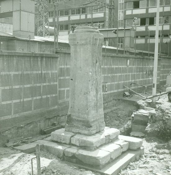 Στην αρχαιότητα το μνημείο ήταν περίοπτο και στημένο σε σχέση με τον δεύτερο σπουδαιότερο αρχαίο οδικό άξονα της πόλης μεταξύ της Ληταίας και της Νέας Χρυσής Πύλης (σημερινή οδός Αγίου Δημητρίου), στη διασταύρωση με την κάθετη οδό της σημερινής οδού Αντιγονιδών, ενταγμένο ίσως σε μία πλατεία. Σταδιακά και με την άνοδο της στάθμης του αρχαίου δρόμου η κρηπίδα του καταχώθηκε. Το 1975 στο πλαίσιο των εργασιών για τη διαπλάτυνση της οδού Αγίου Δημητρίου το μνημείο μετακινήθηκε κατά 5,50μ. προς Βορρά επί του νέου πεζοδρομίου της σύγχρονης οδού. Η βαθμιδωτή κρηπίδα του δεν είναι ορατή, καθώς τοποθετήθηκε με την ανώτερη βαθμίδα της στο ίδιο επίπεδο με τη στάθμη του πεζοδρομίου.