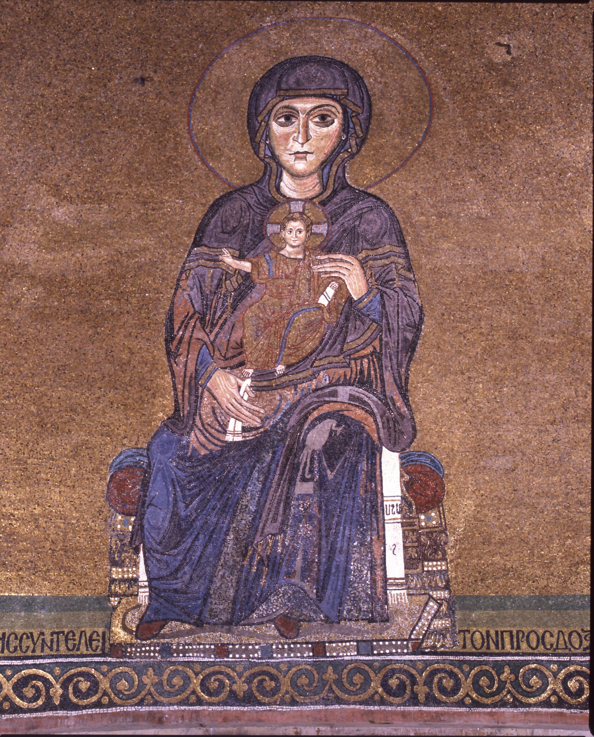 Από τον αρχικό ψηφιδωτό διάκοσμο του ναού διασώθηκαν παραστάσεις στο ιερό και στον τρούλο, όλες μεταγενέστερες της ίδρυσής του. Στην αψίδα του ιερού κυριαρχεί η μορφή της Παναγίας, καθισμένης σε θρόνο, με τον Χριστό στην αγκαλιά. Το ψηφιδωτό αυτό αντικατέστησε μεγάλο εικονομαχικό σταυρό, που διακρίνεται ακόμη αχνά στο χρυσό βάθος. Το κέντρο της καμάρας του ιερού καταλαμβάνει κυκλικό μετάλλιο με σταυρό, ενώ στις απολήξεις της καμάρας αναπτύσσεται τάπητας από επάλληλα τετράγωνα, που εγγράφουν σταυρούς και φύλλα φοίνικα. Στη βάση αυτών των συνθέσεων αναπτύσσεται επιγραφή με τα μονογράμματα των συναυτοκρατόρων Κωνσταντίνου Στ΄ και Ειρήνης και του επισκόπου Θεόφιλου, που είχε λάβει μέρος στην Ζ’ Οικουμενική Σύνοδο, της Νίκαιας, το 787.
