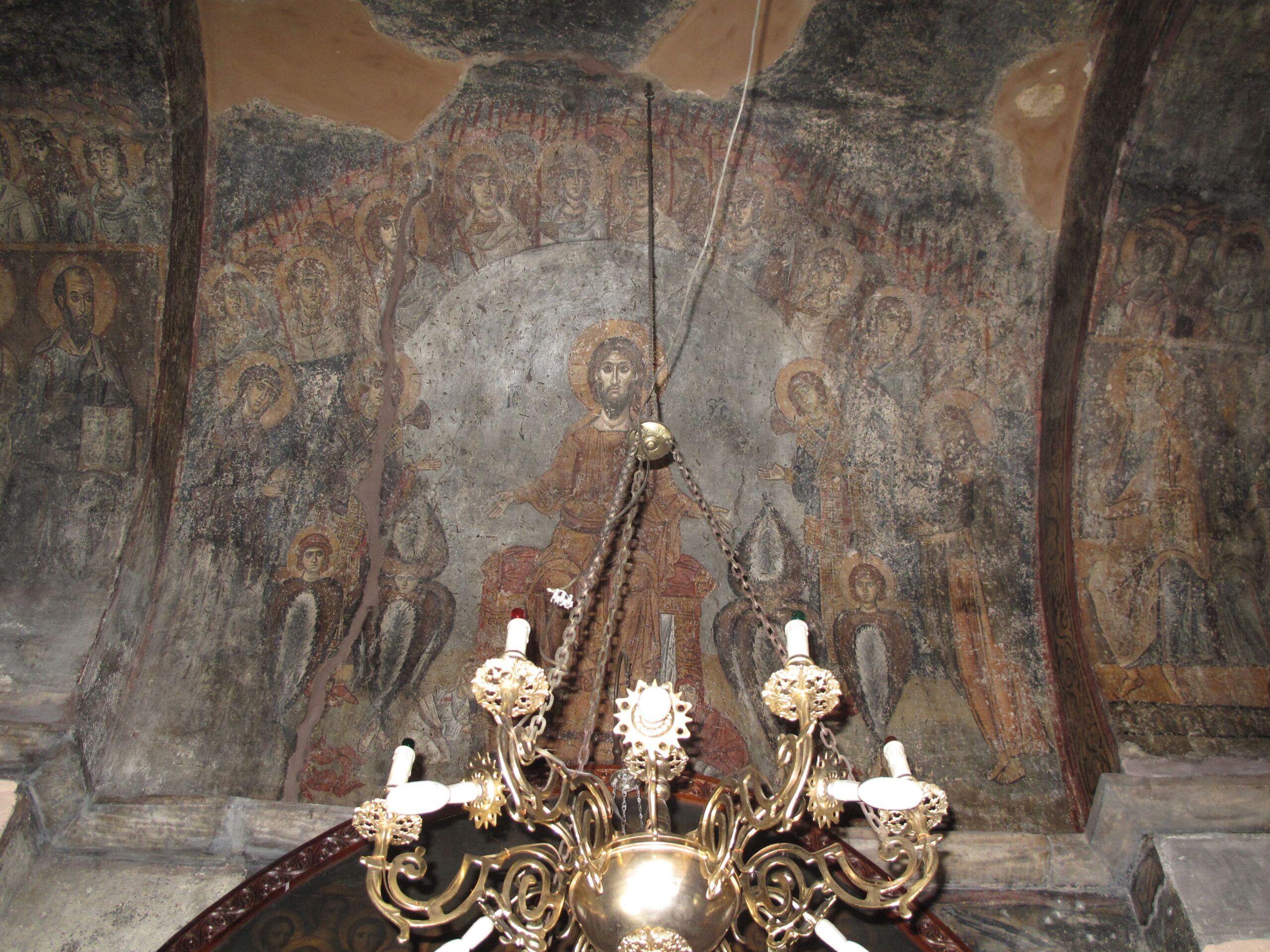 Στον τρούλο εικονίζεται η Ανάληψη: στο κέντρο ο Χριστός ευλογεί, καθισμένος σε ουράνιο τόξο που ανεβάζουν στον ουρανό δύο άγγελοι. Γύρω του στέκουν έκπληκτοι δώδεκα απόστολοι, η δεόμενη Παναγία και δύο άγγελοι που την περιστοιχίζουν. Το Όρος των Ελαιών αποδίδεται σαν μια ζώνη πολύχρωμων στρογγυλεμένων βράχων, ενώ δέντρα, ελιές και φοίνικες, περιβάλλουν τις επίγειες μορφές. Από τις τοιχογραφίες του 11ου αι στο νάρθηκα του ναού διατηρούνται μορφές μοναχών, μεταξύ των οποίων τοπικοί άγιοι της Θεσσαλονίκης, όπως η Αγία Θεοδώρα. Στο εσωτερικό του ναού εντοπίστηκαν ταφές των παλαιολόγειων χρόνων, που έχουν αποδοθεί σε μητροπολίτες και κληρικούς.