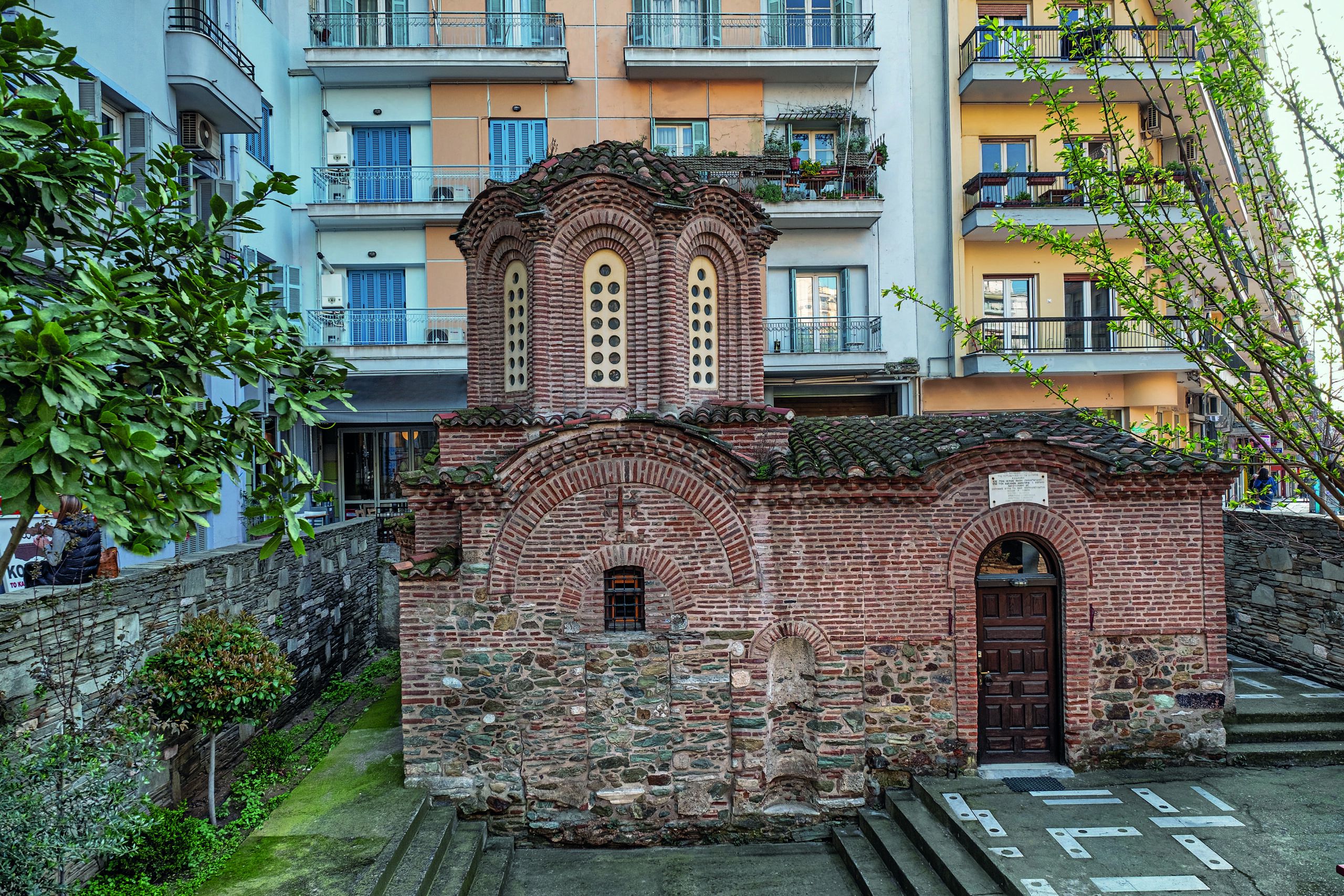 Ο ναός της Παναγίας των Χαλκέων βρίσκεται στο κέντρο της εντός των τειχών πόλης, αμέσως βόρεια της άλλοτε βυζαντινής Λεωφόρου. Σύμφωνα με την κτητορική επιγραφή στο μαρμάρινο υπέρθυρο της δυτικής εισόδου ο ναός κτίστηκε στα 1028 από τον αξιωματούχο Χριστόφορο Πρωτοσπαθάριο και κατεπάνω Λαγουβαρδίας. Ανήκει στον τύπο του σύνθετου τετρακιόνιου σταυροειδούς εγγεγραμμένου με διώροφο νάρθηκα στα δυτικά. Είναι κτισμένος αποκλειστικά με πλίνθους, στο κόκκινο χρώμα των οποίων οφείλεται και η ονομασία «Κόκκινη εκκλησιά». Στον βόρειο τοίχο διαμορφώνεται αρκοσόλιο που αποδίδεται στον τάφο του κτήτορα.